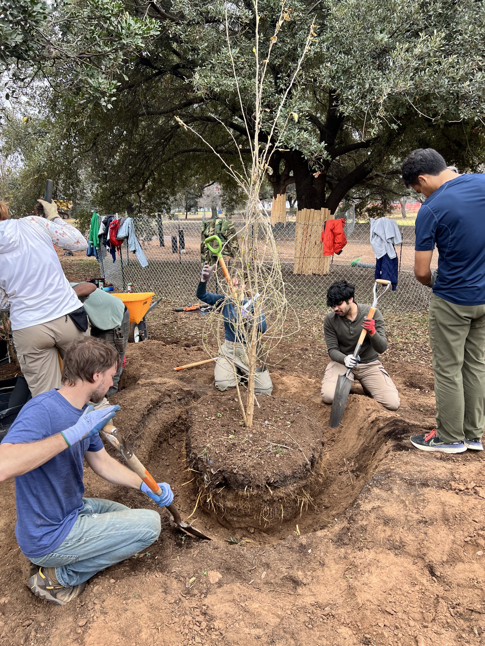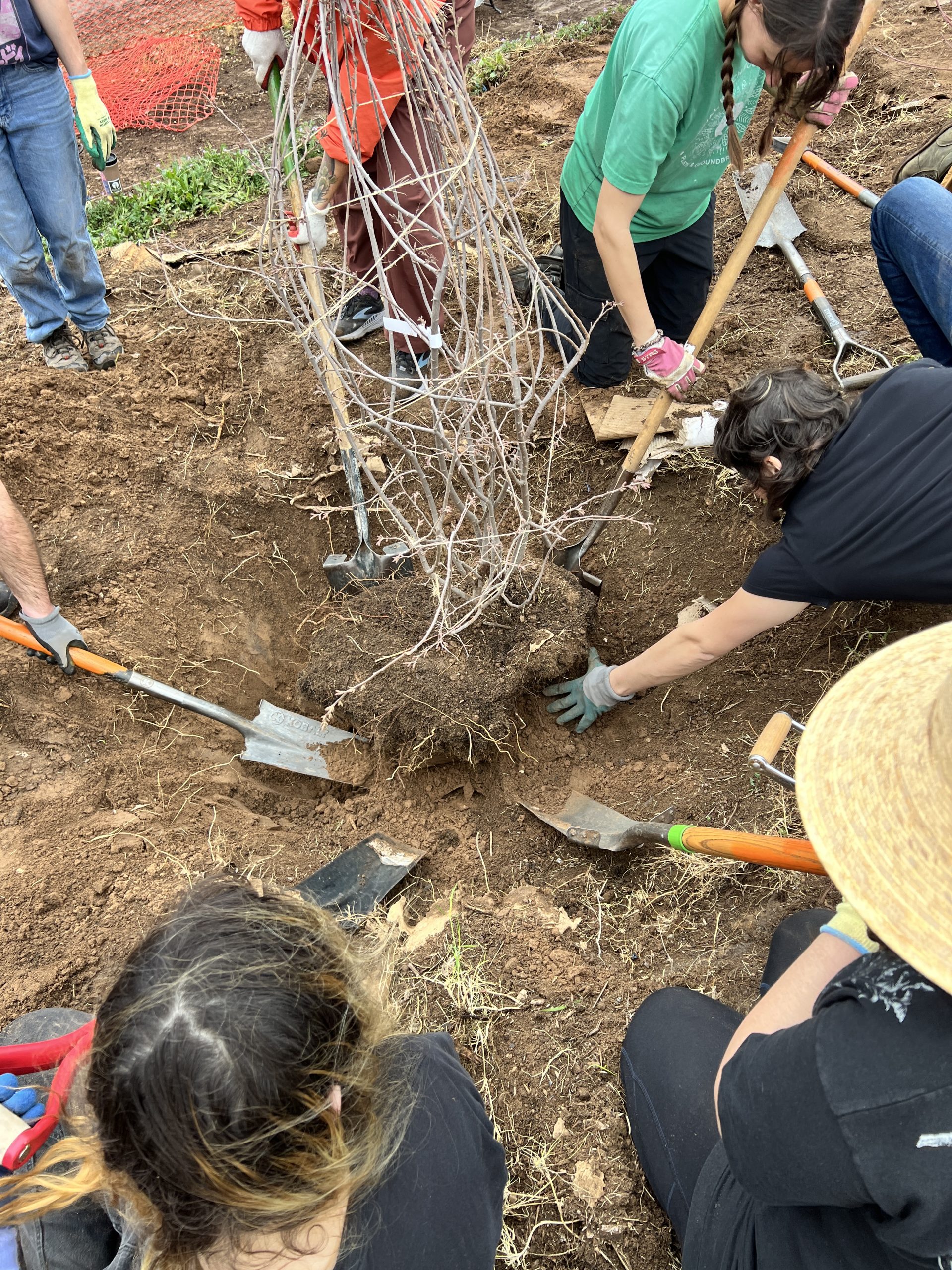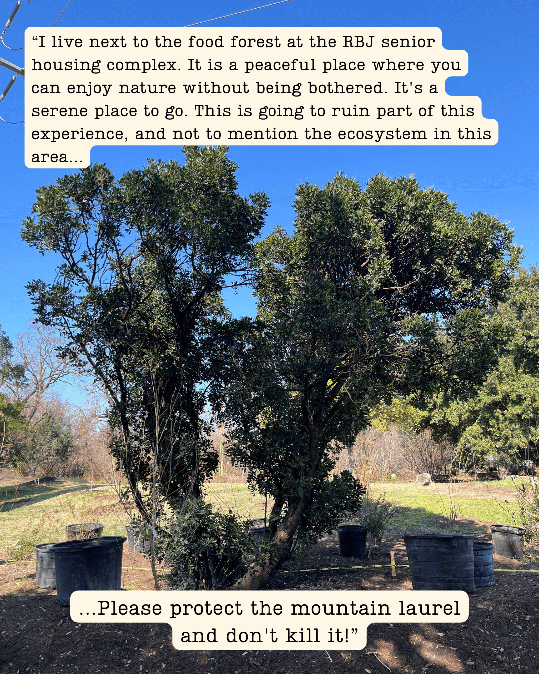 Ultimately, we were only granted a two-day pause from TxDOT, and facing the imminent destruction of our barrier berm, our team moved forward with the difficult decision to un-plant 90 young trees and shrubs from the affected area. These plants are currently being stored and cared for off-site, and we hope to re-plant them in the Food Forest very soon. The City of Austin was also able to assist with relocating a 40-year-old Mountain Laurel out of the path of destruction.