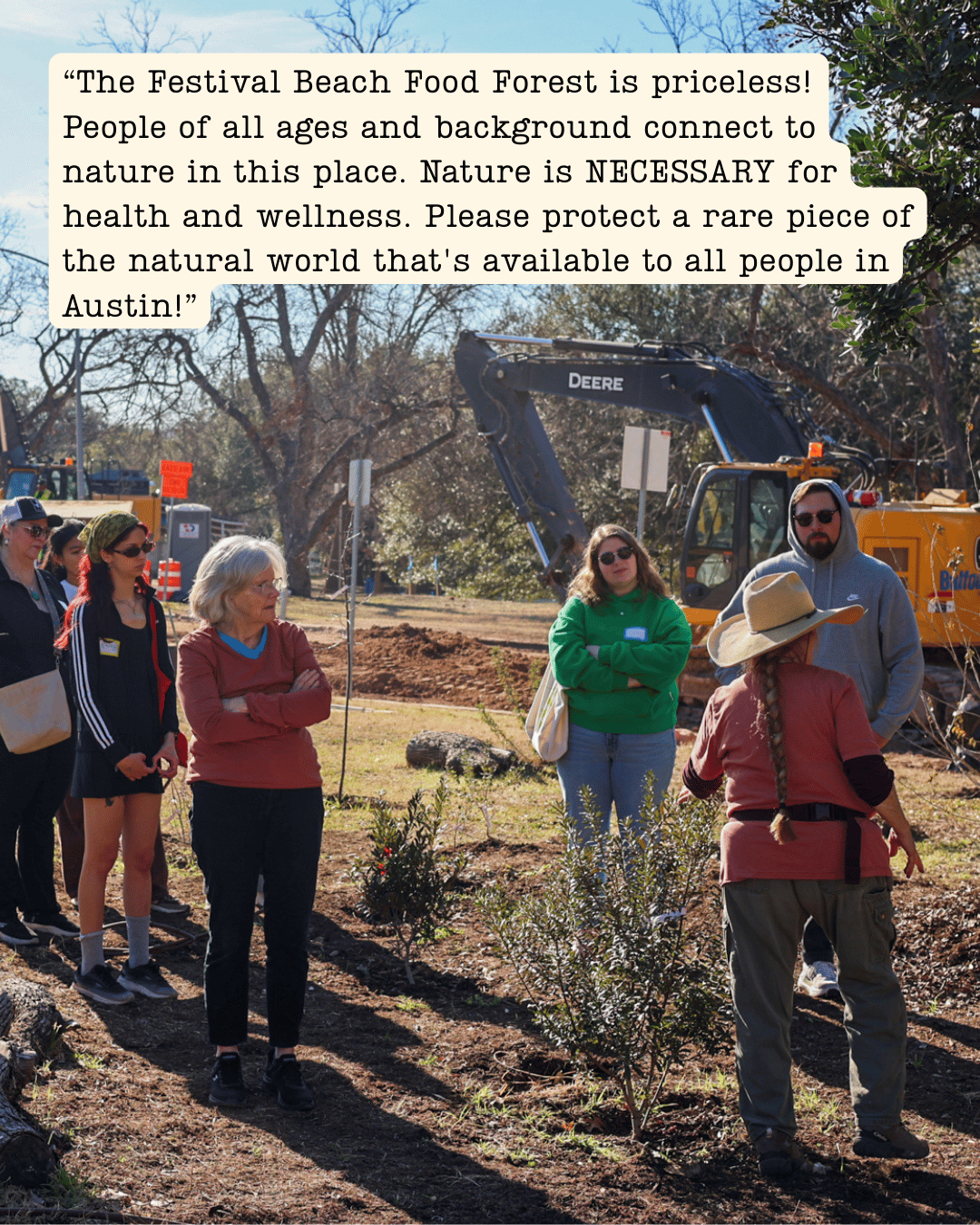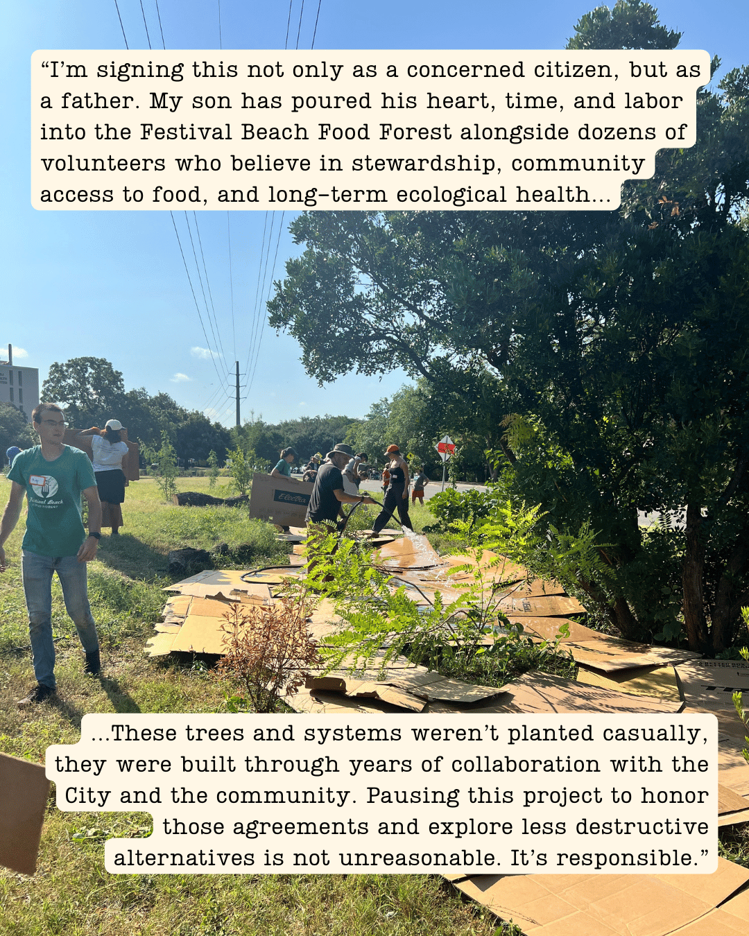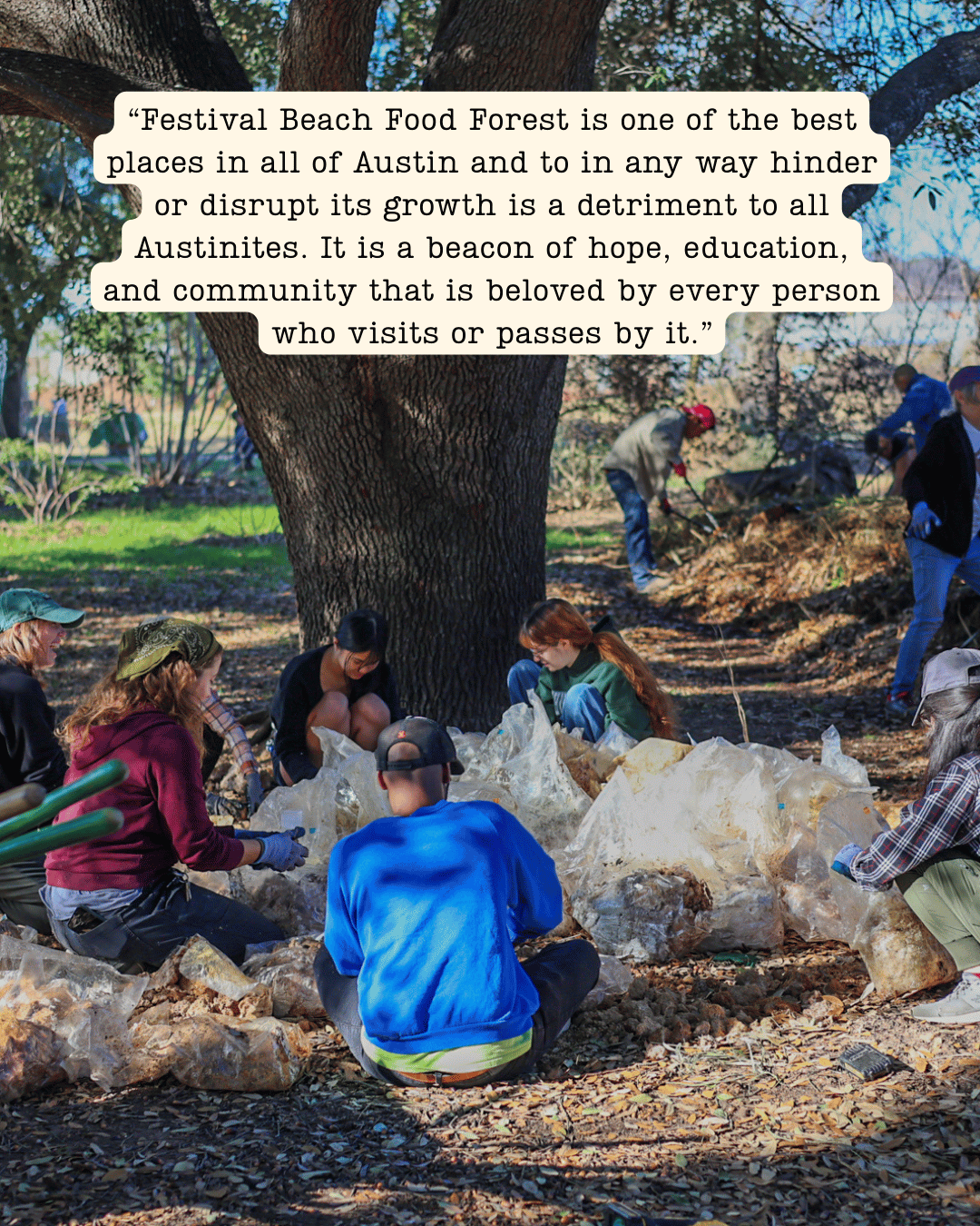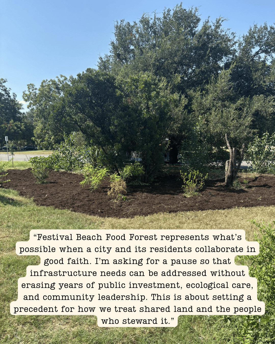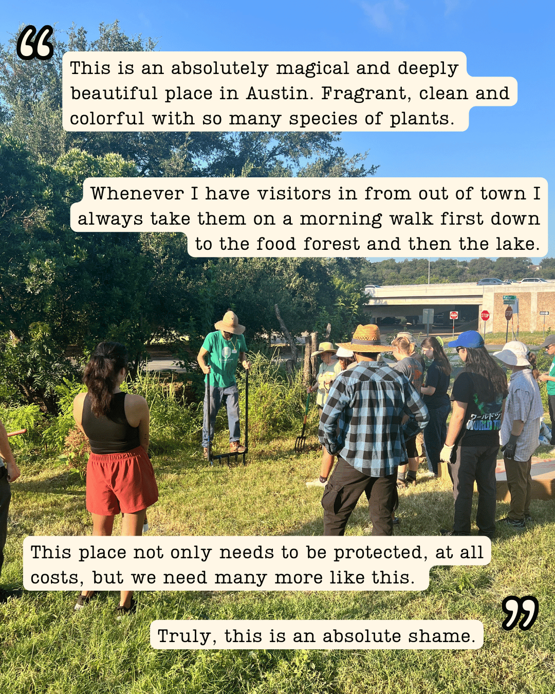 We are in this for the long haul, and we will continue to keep this page updated as we move forward. The path to restoration is not yet clear, and we expect to have additional calls to action in the coming weeks. The I-35 TxDOT project will continue to impact the forest and the surrounding areas. Construction is set to last for up to a decade and the damage for many more decades to come. We must ensure the City is taking care of its public spaces and its people. To do this, we need your enduring support.