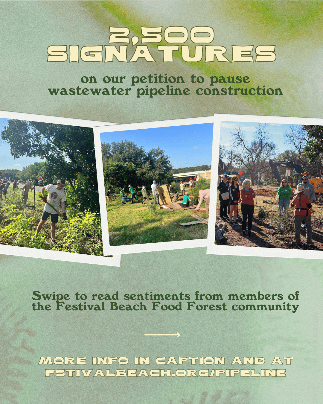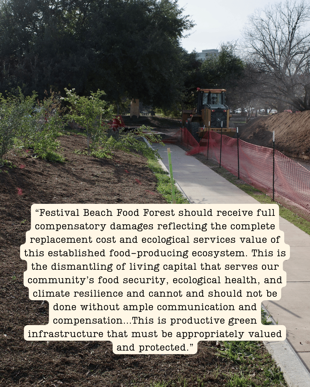 Since January 6, 2026, the Festival Beach Food Forest team has been responding to an unexpected and insufficiently communicated wastewater pipeline relocation project associated with TxDOT’s I-35 expansion. We offer our heartfelt gratitude to the community for answering our calls to action, helping to salvage plants from our barrier berm, and donating to our mitigation fund.